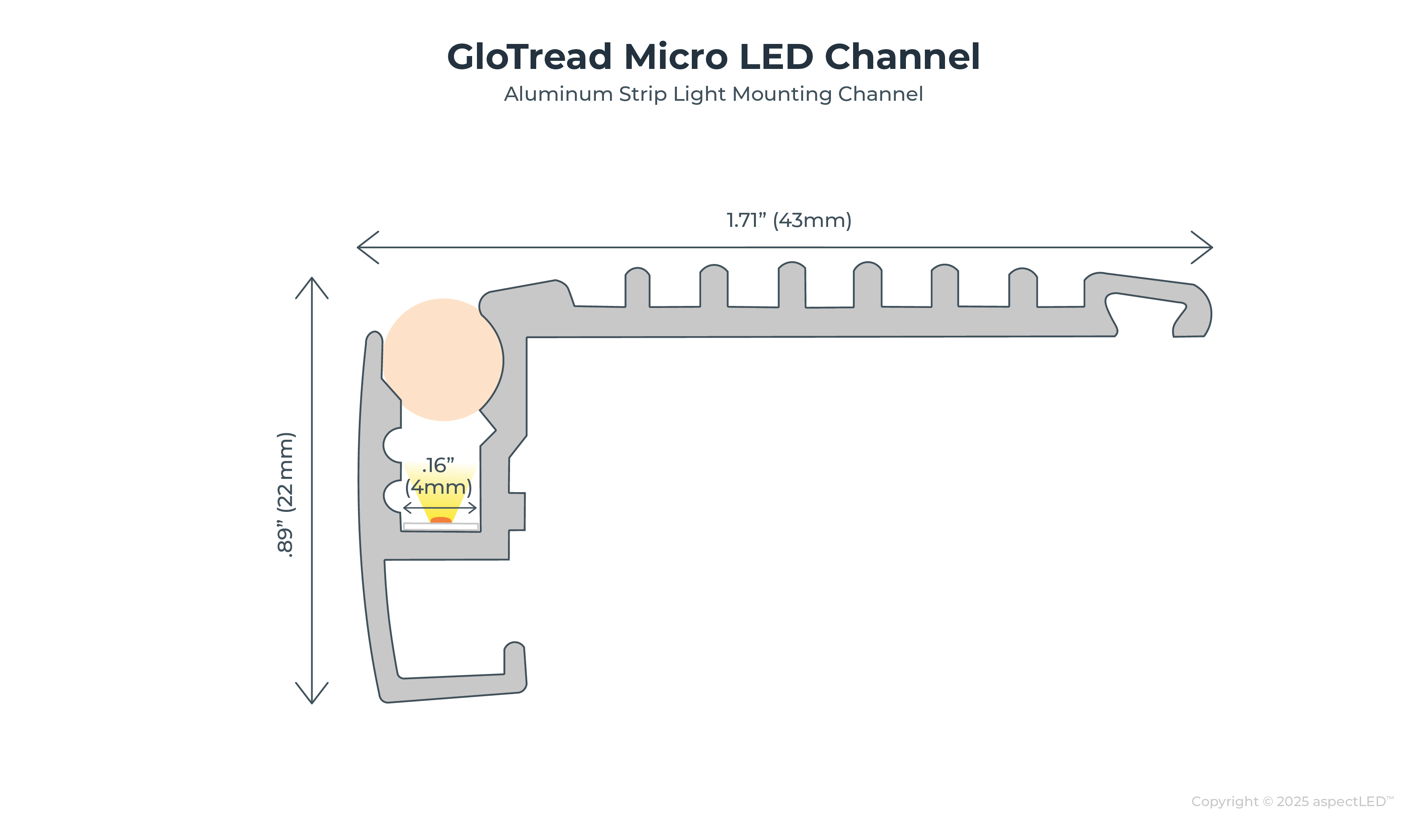 GloTread Channel is engineered to enhance stair safety and visibility. Made from durable aluminum, it protects strip lights, delivers even light diffusion, and is tough enough to withstand foot traffic. The included silicone lens creates a smooth, linear glow with minimal visible hot spots from the LEDs. With a low-profile height of just 0.87", it minimizes the risk of tripping hazards for foot traffic. This channel is compatible with aspectLED’s X-Series Strip Lights or any strip light 4mm wide or less.