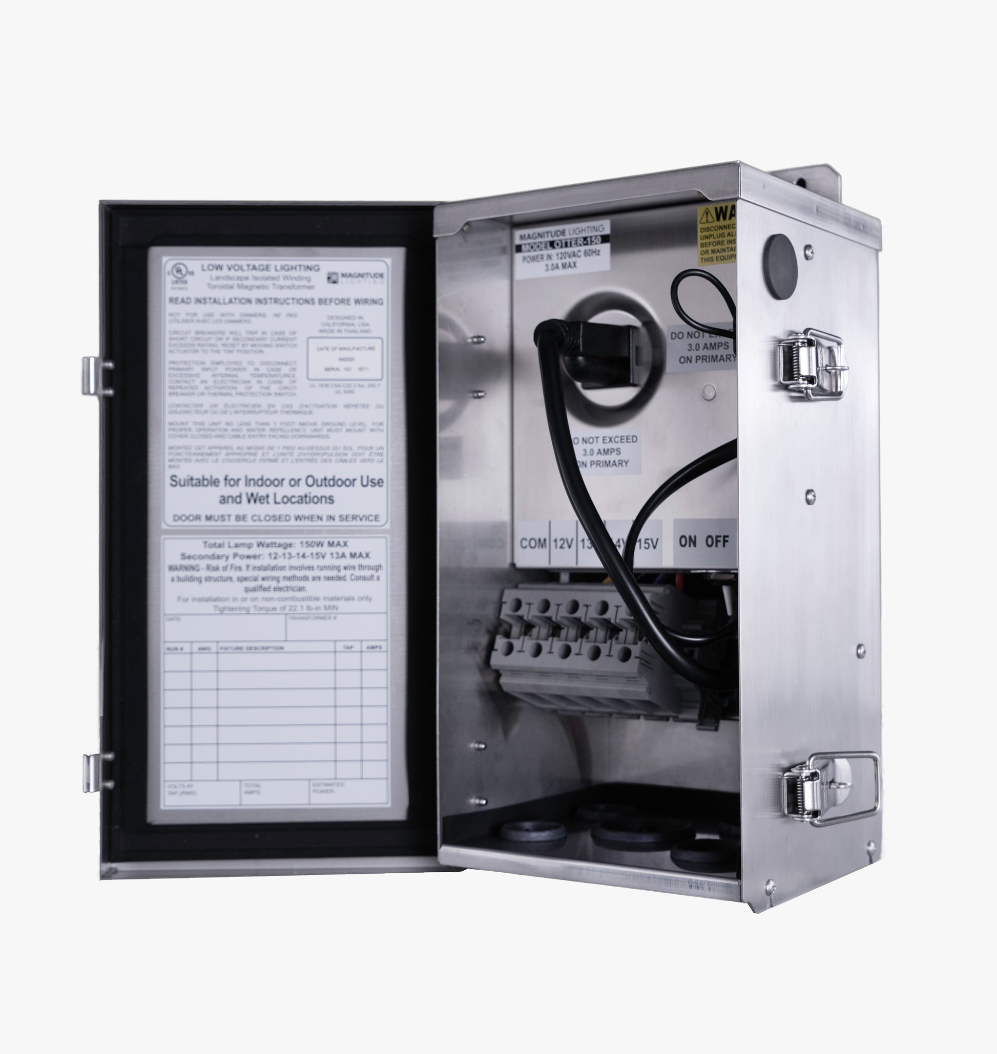 Magnitude Otter™ is a high-performance landscape transformer series for landscape lighting applications. Compact and waterproof, the Magnitude Otter™ hides easily and is engineered with features that reduce time, labor and profit-draining callbacks. Surge protector and photoelectric eye included in box.