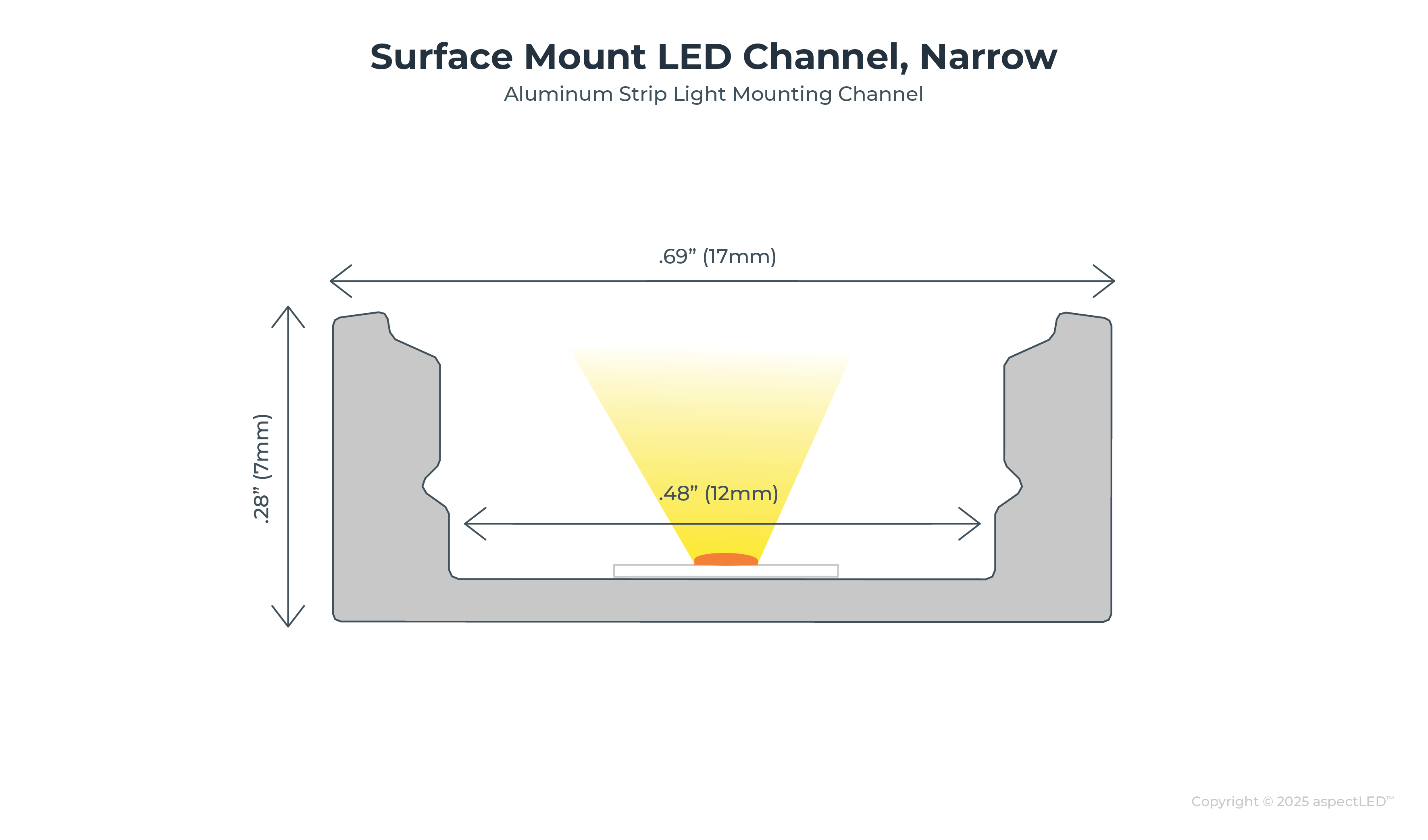This surface mount channel is compatible with all indoor-rated (IP20) strip lights up to 12mm wide. Available in sleek silver or black aluminum finishes, it can be paired with clear or frosted lenses for maximum brightness and diffusion, or a smoke lenses for subtle accents. Its slim 0.28" low-profile design makes it ideal for tight or challenging spaces. Crafted from durable aluminum, it shields strip lights from damage and tampering, while providing smooth, even light diffusion and effective heat dissipation to extend LED lifespan.